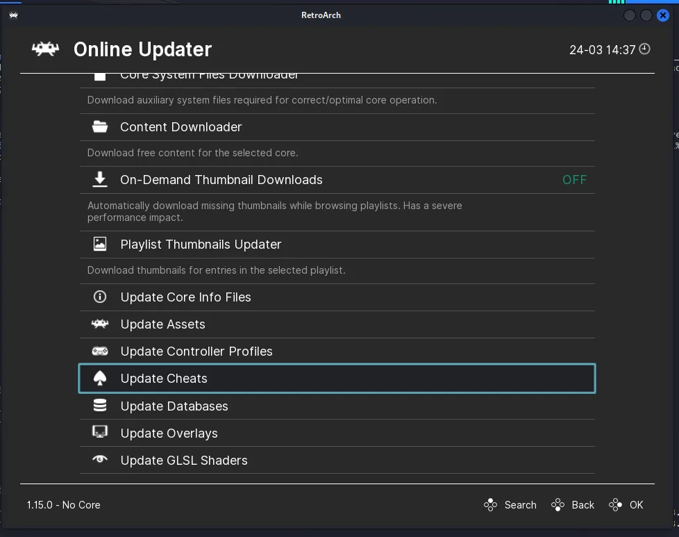 That is exactly the information we want. You may recall that we downloaded the snes9x core for our SNES games, and we see it right there, along with all the cores I downloaded for the other consoles I added later.