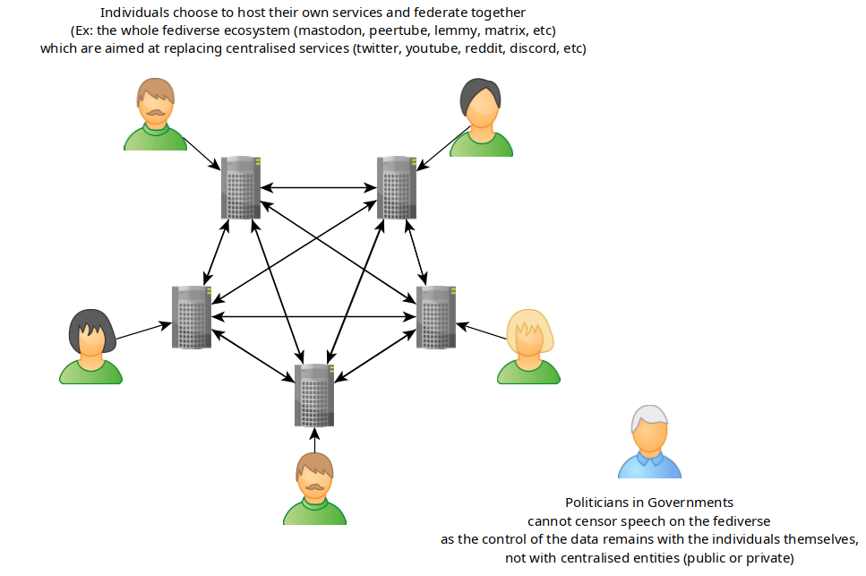 If the masses were to completely change their habits and embrace decentralisation, like i am trying to promote on nowhere.moe for example using peertube to replace youtube, matrix to replace discord, mastodon to replace twitter, etc, it would seriously limit the reach of the power they try to have on the population. They wouldn't be able to censor and try to control the public opinion of the people like they did through twitter for example.