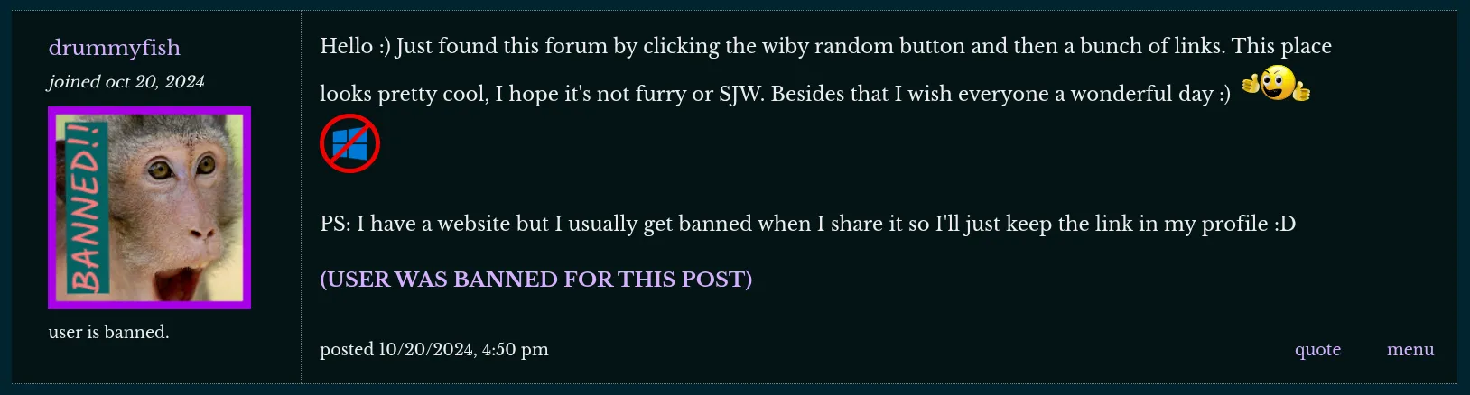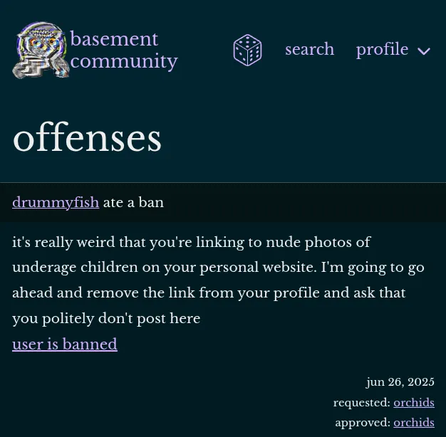 A log of offenses on Basement Community is kept and in June of this year, a user called drummyfish was promptly banned after making this post.