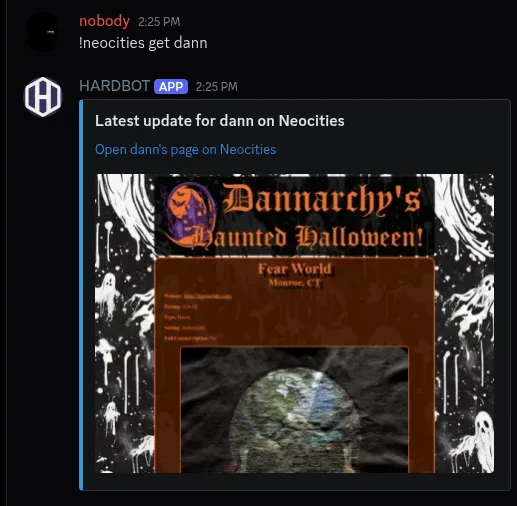This will fetch the latest update from neocities and embed it into the channel.