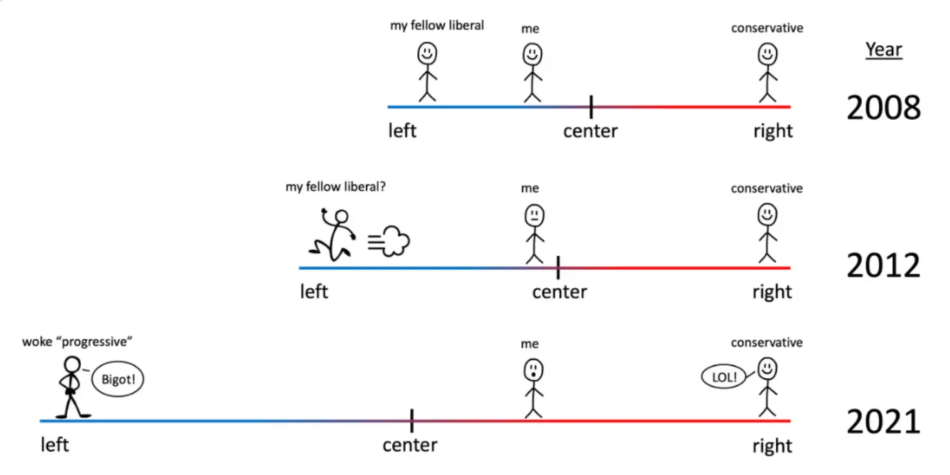 Practically though, you're always punished for this in a left-wing space. At any time someone can take your center stance as evidence that you're a bogeyman. They will overreact. When other people get the whiff of "not on board with the progress," the sort of struggle session will begin. And there is no making them see, "Oh, he's actually not like that." They don't want to find that. They want blood.